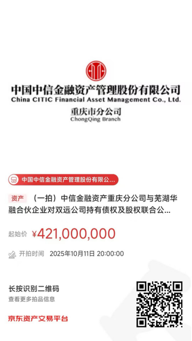 betway百科重庆市分公司(简称:中信金融资产重庆分公司)与芜湖华融资本创荣投资中心(有限合伙)(简称:芜湖华融合伙企业)对重庆双远实业(集团)有限公司(简称:双远公司)持有债权及股权,将于2025年10月11日20时至2025年10月12日20时在京东拍卖网通过公开竞价方式进行处置,拍卖链接如下图所示,现予以公告。